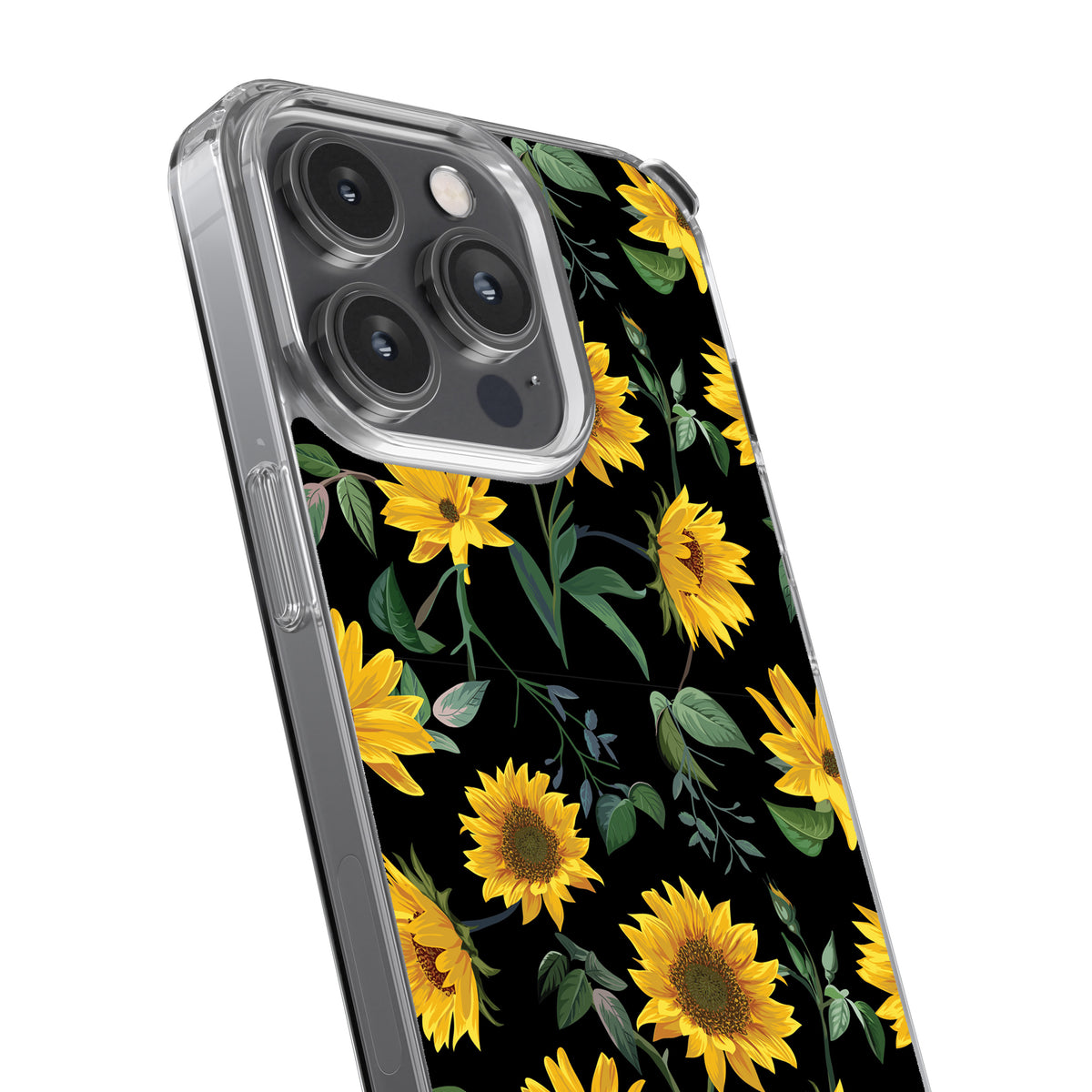 Bright sunflowers bloom against a dramatic black background, making a bold statement of warmth, happiness, and strength.