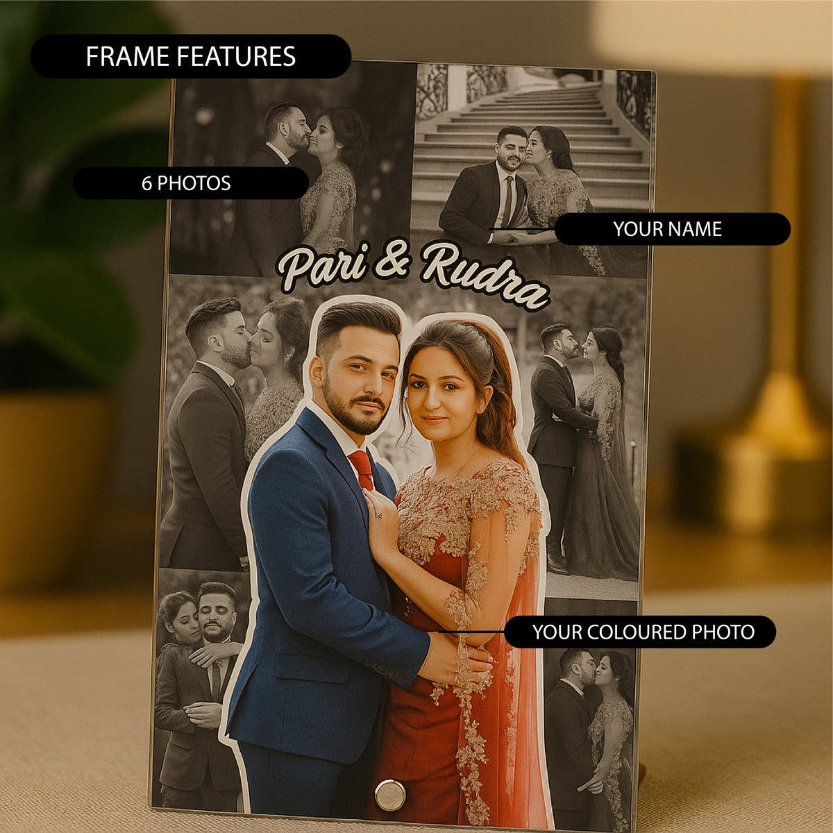 A blend of timeless emotion and modern design, this frame turns your most meaningful moments into a classic black-and-white story — with one vibrant photo that brings everything to life.